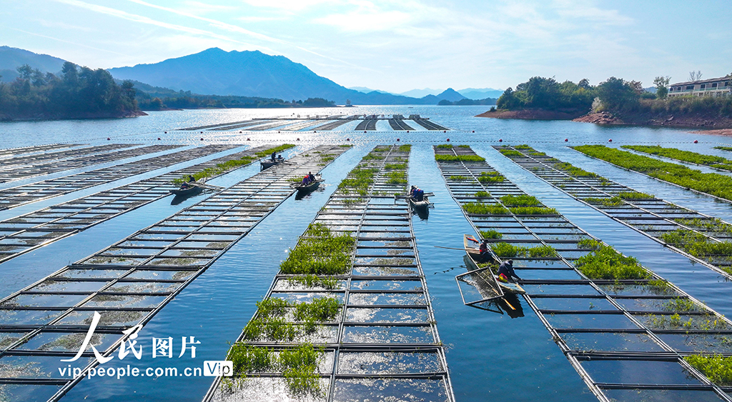 2025年11月18日,浙江省杭州市淳安县千岛湖镇坪山水域21亩生态浮岛上,工作人员正在进行冬季田间管理,清理空心菜、修整加固浮床,为换种冬季水芹做准备。 淳安县为保护千岛湖优质水质,积极应...