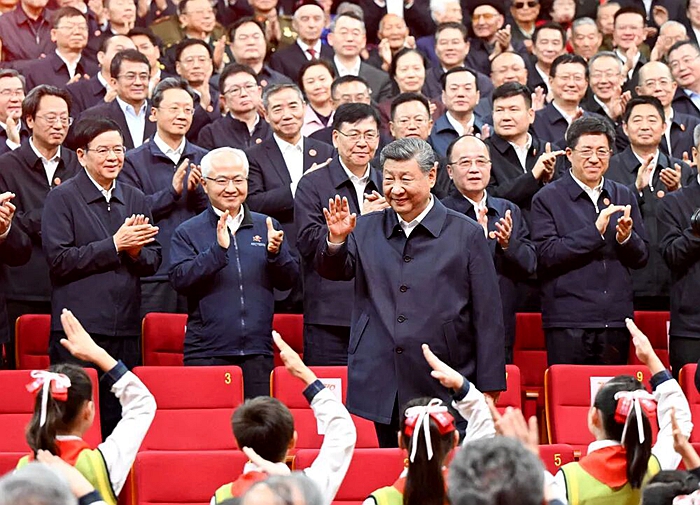 9月24日晚,庆祝新疆维吾尔自治区成立70周年文艺晚会《美丽新疆》在乌鲁木齐文化中心大剧院举行。中共中央总书记、国家主席、中央军委主席习近平观看演出。图为习近平向观看演出的新疆各族干部群众挥手...