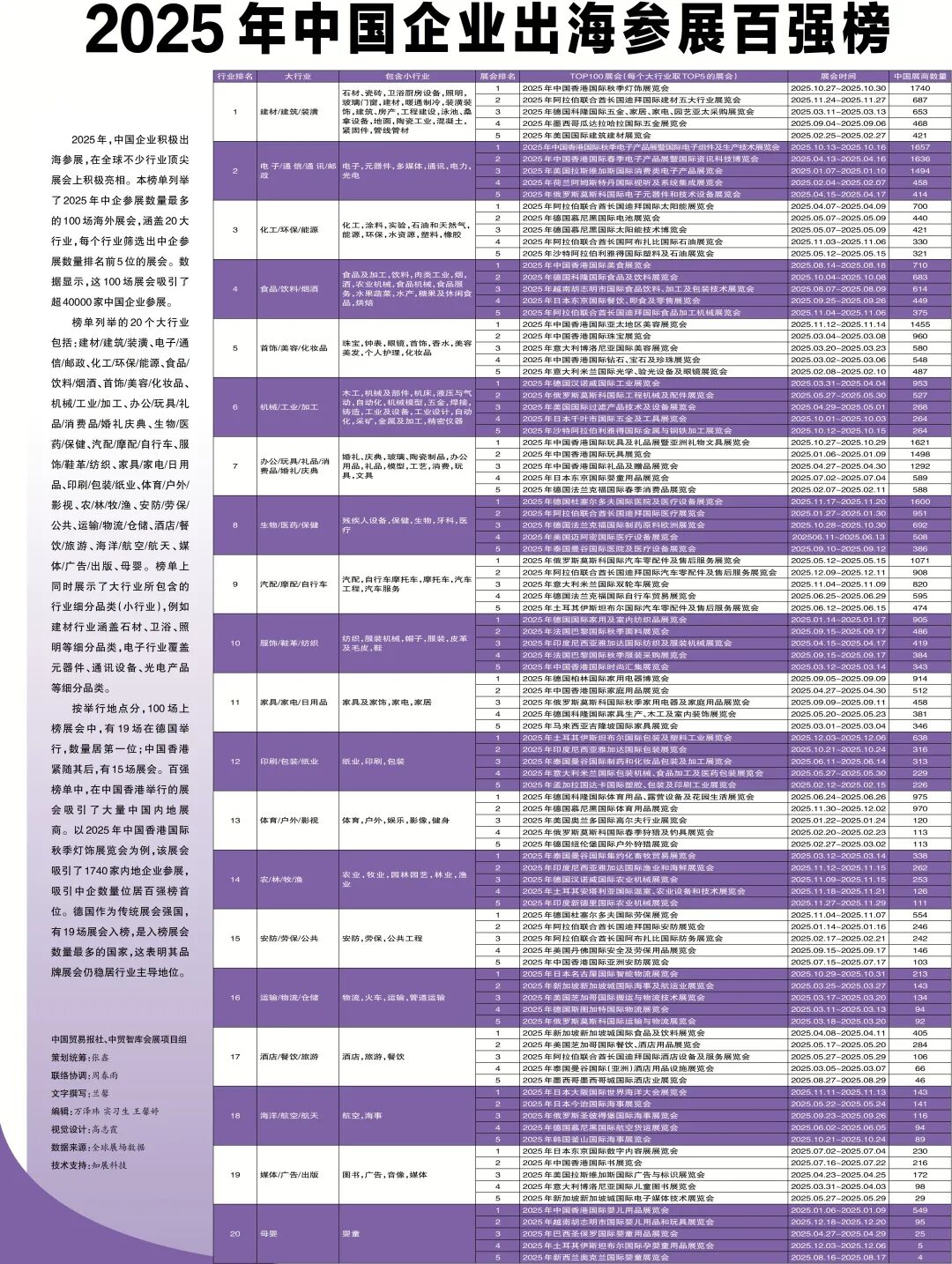 导语 2025年,中国企业积极出海参展,在全球不少行业顶尖展会上积极亮相。本榜单列举了2025年中企参展数量最多的100场海外展会,涵盖20大行业,每个行业筛选出中企参展数量排名前5位的展会。数...